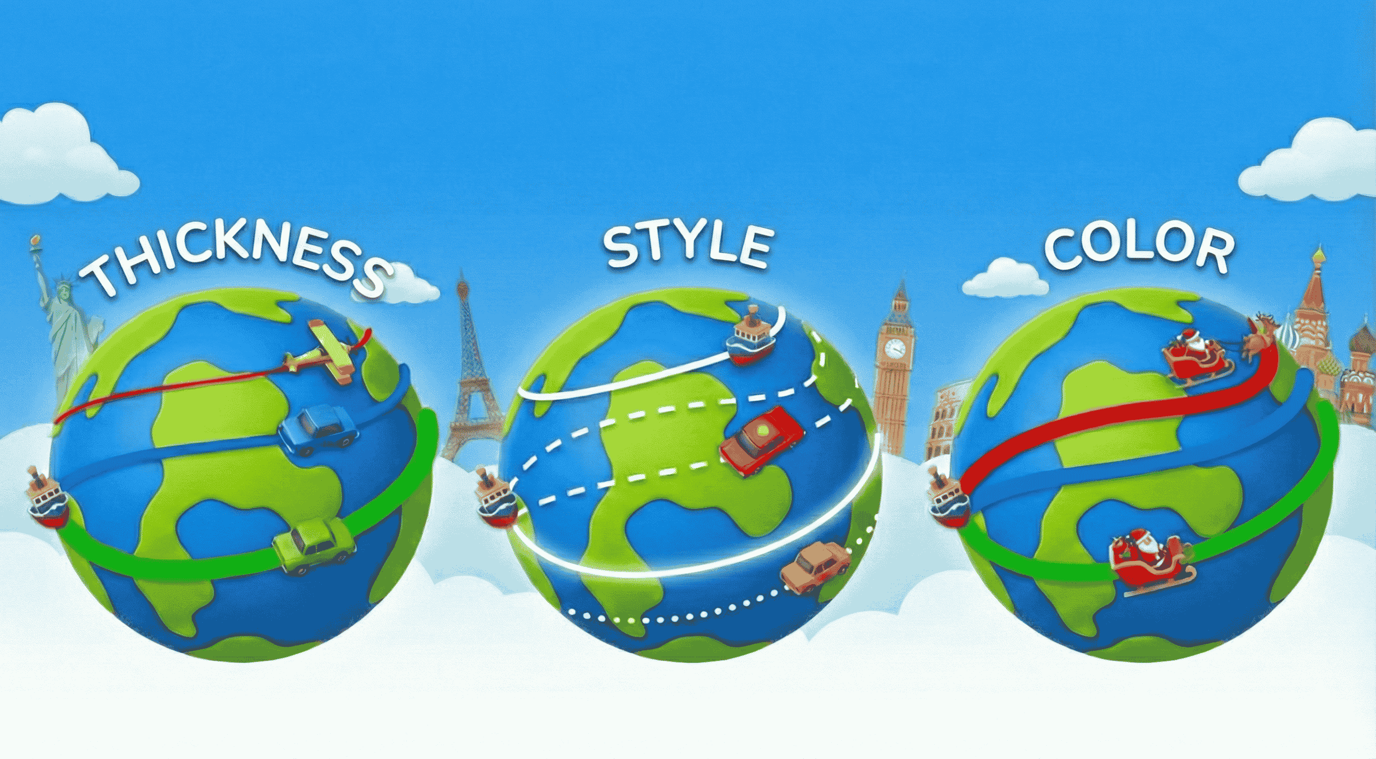 • Style: dashed, glowing, striped, solid, dotted, or hybrid